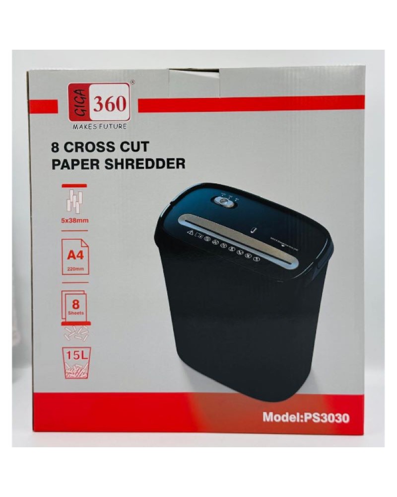Destructeur de documents jusqu’à 8 feuilles par passage et 15L de Corbeille, coupe transversale de 5 x 38mm DESCRIPTION DU PRODUIT : ◉ Nom : Destructeur de papiers ◉ Marque : GIGA 360 ◉ Modèle : PS3030 ◉ Type de coupe : coupe transversale ◉ Taille de coupe croisée : 5 x 38mm ◉ Capacité de coupe : 8 feuilles ◉ Vitesse de coupe : 2,25mt/min ◉ Corbeille de 15L facile à vider